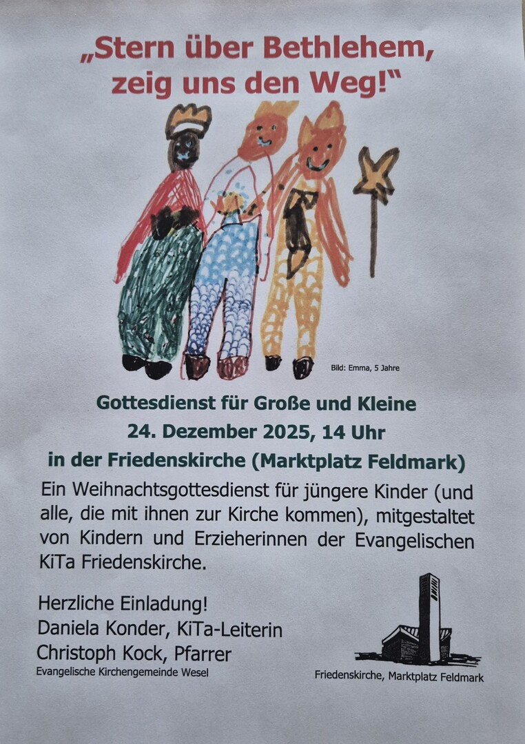 Wir möchten alle Familien und Menschen rund um die Kita recht herzlich zu unserem diesjährigen Weihnachtsgottesdienst am 24.12.2025 einladen.